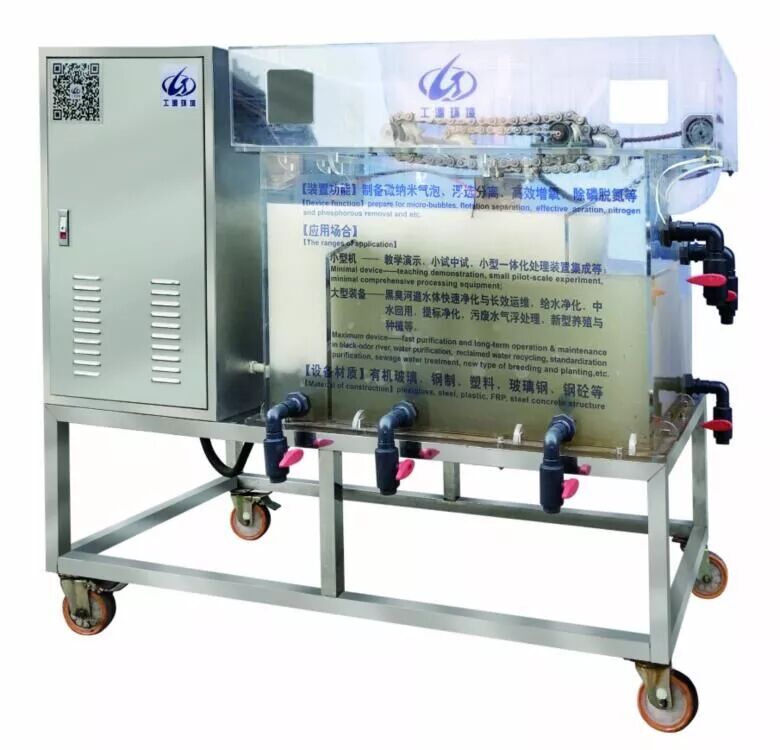 工源公司自主研发的微纳米曝气系统,由微纳米气泡发生器,扩散装置、浮潜装置、限位装置、控制装置等组成。该系统可广泛应用于水产养殖、景观工程、河道整治、中水回用、污水处理、气液混合等场合,结合不同的进气气源(如空气、氧气、臭氧、氮气等)与工艺方法,可以高效实现增氧曝气、气浮分离、氧化脱色、脱氮除磷等功能。 实验气浮 GFM实验气浮是我公司专门针对气浮工艺处理各类污水可行性分析而研制开发的新型设备。该设备采用特种有机玻璃制作,可视性能良好,能直接观察气浮各功能区运行状况,为实验分析提供方便。具有结构简单,操作方便,运行直观,性能稳定的特点。广泛应用于各类小型污水处理工程以及大中专院校,科研机构的教学实验用。
